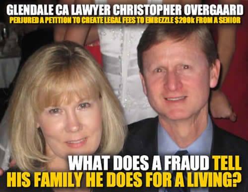 Glendale lawyer Christopher E. Overgaard who perjured his fraudulent petition forcing Gertrude into a forced Conservatorship to hide (2) missing bank accounts for $200,000.00