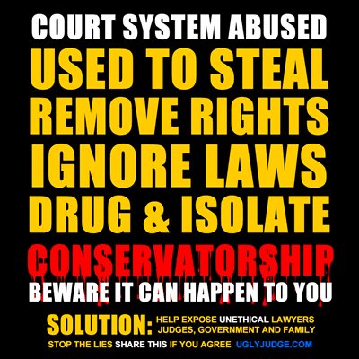 CON-Conservatorship and Guardianship are terms used by lawyers to HIDE CRIME, a vale or con-game which is used against seniors, veterans, disabled, children and mentally ill. The game is to PRETEND you are conserving, guarding or helping. REALITY is they are CREATING HUGE legal fees and forcing someone (against their will) to pay them. Judges become involved when they are rewarded when assigned by the judge or judges involved. Its ONLY done to people who have money, the only reason lawyers do this is for MONEY. The most cowardly, greedy, immoral, dis-honest. They steal, rob, abuse and even murder to get at someones estate or life savings. SEE http://nasga-stopguardianabuse.blogspot.com/ READ THE WHOLE STORY
