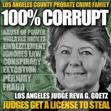 My name is Hubert Allen I have been a party in a probate court case since 10/7/2010 case name Antoinette Townsend trust case number # bp124980 the judge in department # 9 of the Los Angeles Supeior Probate Court Judge Reva G Goetz has allowed lawyers to steal millions of dollars from the said trust my life has been in danger the lawyers in this case have filed numerous fraudulent petitions declaring under the penalty of perjury that everything said on THESE petitions was true and correct the are so many family’s being robbed by the judges and dishonest people that call them selfs attorneys Im not the only victim who has been victimized in the Los Angeles Superior Probate court SYSTEM will this ever stop?