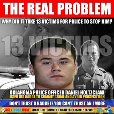 Oklahoma police officer Daniel Holtzclaw is proof police hire the wrong people. On top of that it’s proof that as a police officer victims find it nearly impossible to report them. We’ve gotten reports that victims who go to police to report officers are threatened, abused, terrorized and ignored. This is not some of the time but most of the time. Ever try and report a police officer or judge for crimes or abuse?