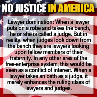 Lawyer domination: When a lawyer puts on a robe and takes the bench, he or she is called a judge. But in reality, when judges look down from the bench they are lawyers looking upon fellow members of their fraternity. In any other area of the free-enterprise system, this would be seen as a conflict of interest. When a lawyer takes an oath as a judge, it merely enhances the ruling class of lawyers and judges.